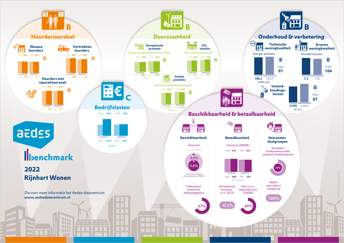 Voor verduurzamingsprojecten die Rijnhart Wonen in 2021 heeft opgeleverd zijn nog oude energielabels verwerkt in de benchmark. Ook konden niet alle actuele isolatiescores goed worden opgenomen. Dat betekent dat we de verbeteringen van 150 bestaande woningen niet terugzien in de benchmark van 2022. Hetzelfde geldt voor de ruim 50 nieuwbouwwoningen. De sector laat gemiddeld wel een verbetering zien, waardoor onze resultaten net de grens overgaan van A naar B op 2 deelscores.
